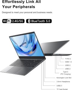• EXTENSIVE CONNECTION PORTS – This Laptop Features USB-C Full-Function Jack, 2x USB 3.2 Jack, 1x USB 2.0 Jack, 1x HD-MI Jack, 1x TF card slot, 1x Headphone Jake, 1x Type-C Charging Jack. It offers powerful wireless connectivity with support for 2.4G+5G WiFi and Bluetooth 5 for fast downloads and streaming. A full-size ergonomic keyboard and spacious touchpad enhance your typing and navigation experience.